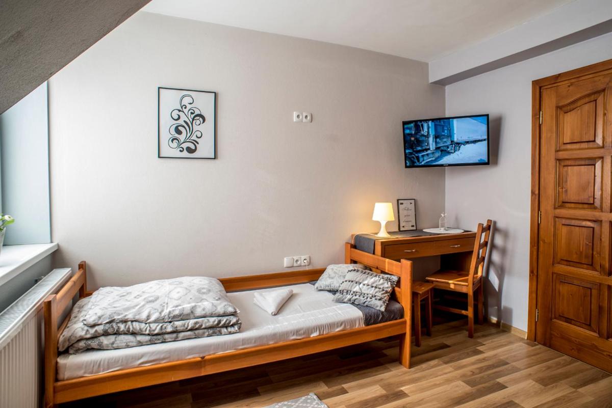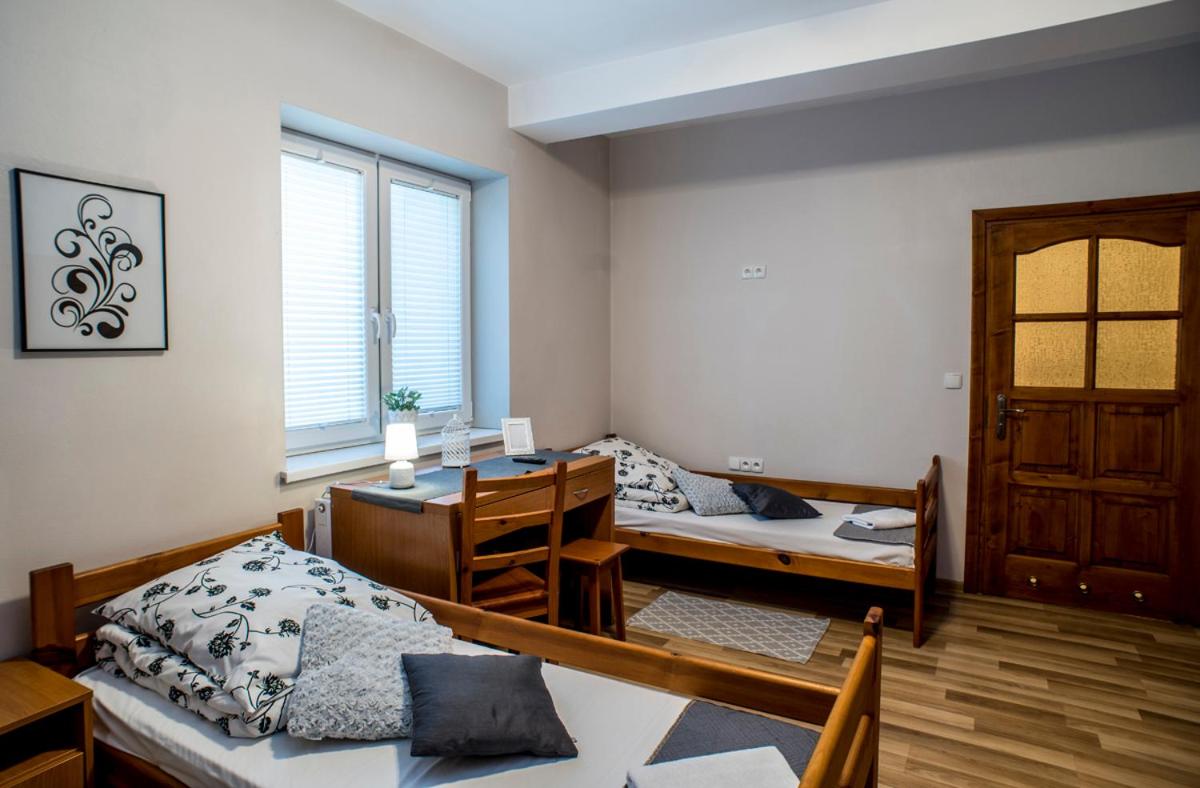 Pokój Czteroosobowy. Jest to pokój z widokiem na zieleń. Wyposażenie obejmuje telewizor z dostępem do kanałów kablowych oraz lodówkę. Do dyspozycji Gości jest łazienka z prysznicem i bezpłatnym zestawem kosmetyków. Pokój Czteroosobowy - 9 osobowy. Powierzchnia pokoju ok.: 20 mkw.