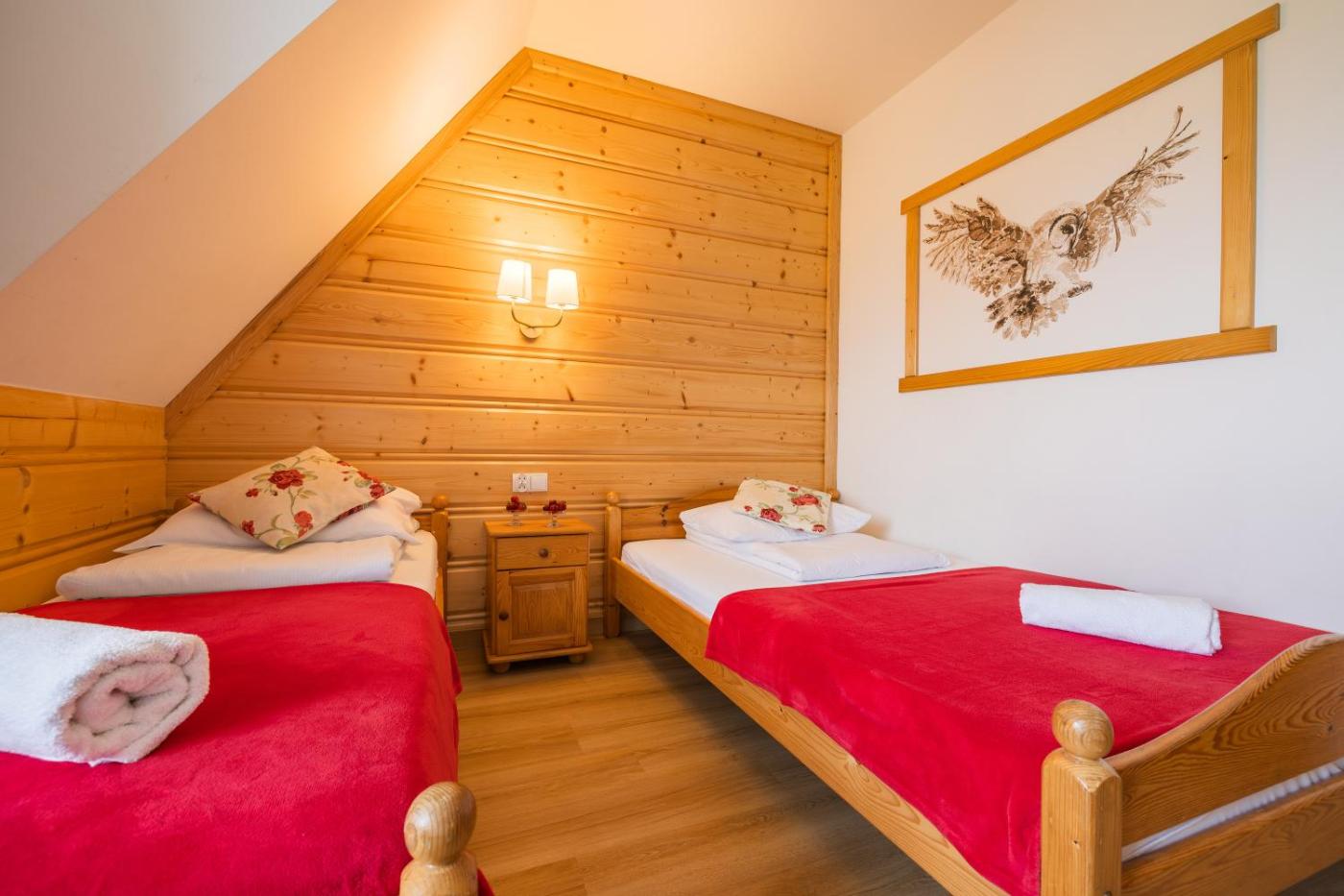Pokój z 2 łóżkami pojedynczymi. Ten jasny pokój wyposażony został w drewniane meble. Jest to pokój z łazienką i widokiem na las. Pokój z 2 łóżkami pojedynczymi - 2 osobowy. Powierzchnia pokoju ok.: 13 mkw. ;